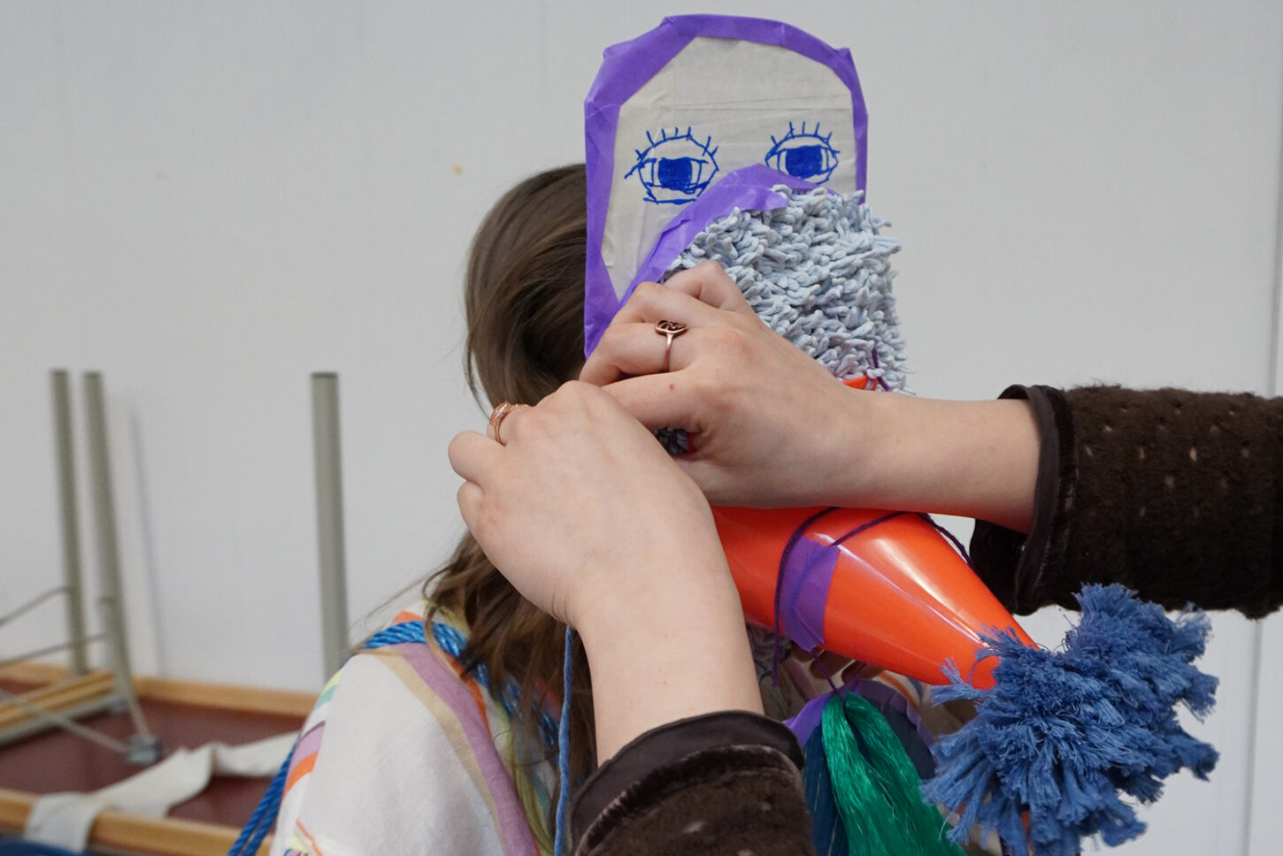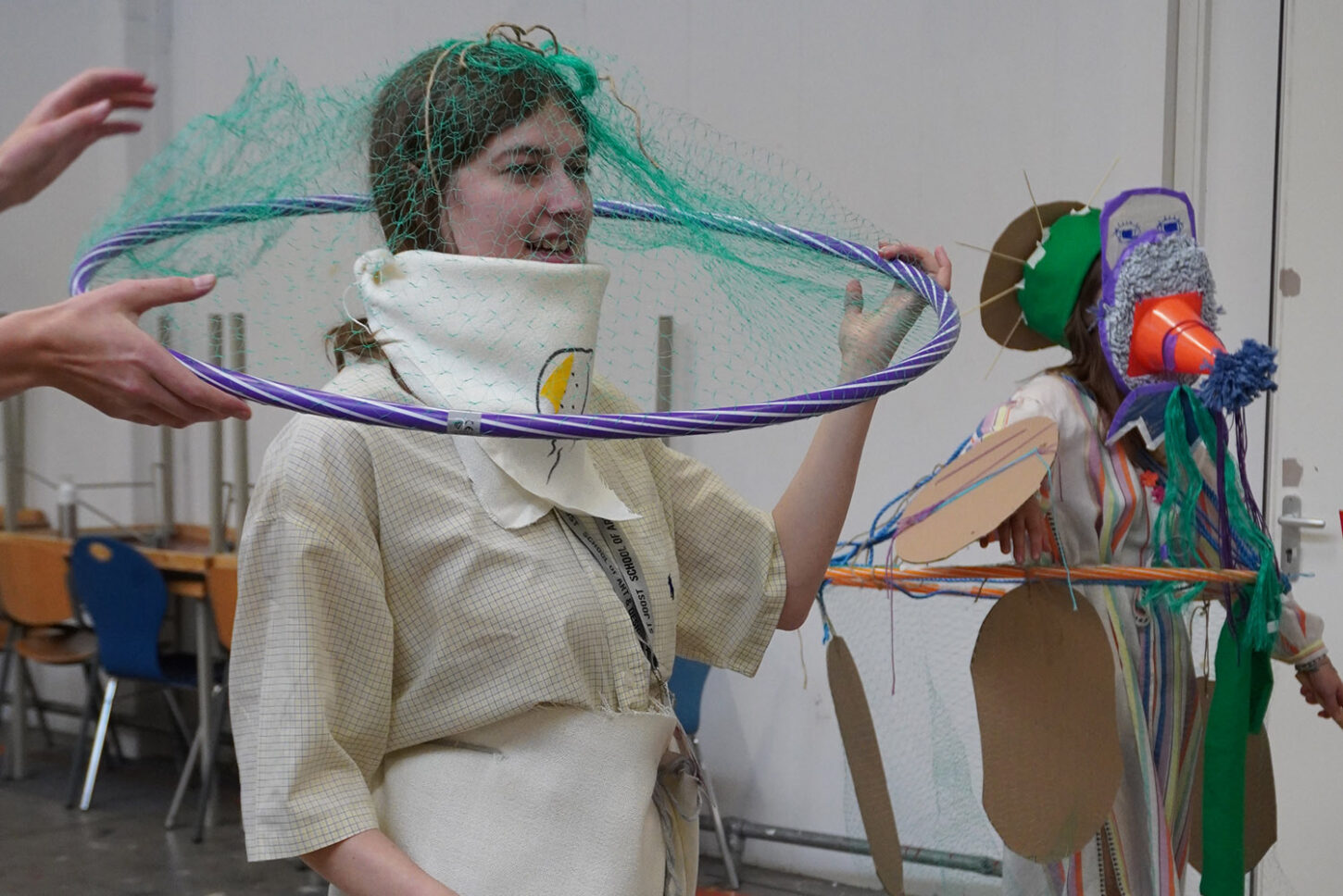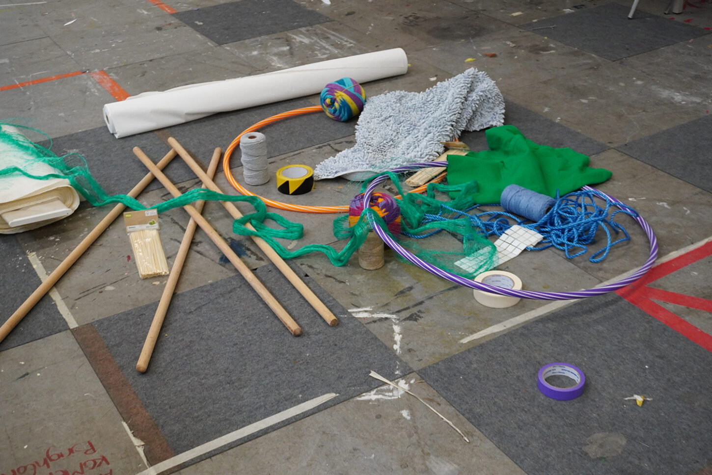 In deze workshop onderzoeken we het lichaam zintuiglijk. Door toekomstige (fictieve en realistische) scenario’s te schetsen visualiseren we mogelijke aanpassingen aan onze zintuigen en ons lichaam. Hoe zouden we kunnen evolueren om te overleven? Wat als we zouden leven in totale duisternis? Wat als boven en onderwater geen onderscheid meer kent? Het stellen van deze vraag leidde tot allerlei creaties gemaakt met de stapel aan materiaal die we hadden meegenomen. De deelnemers presenteerden hun werk in kleine groepen aan elkaar.